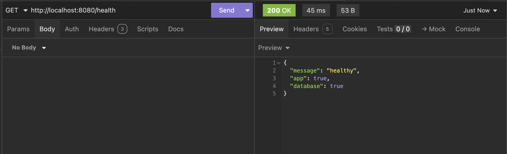 With any client (curl, Insomnia, etc), perform a simple request to /health from your local machine.