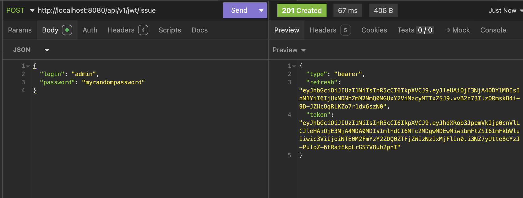 Let's test a token generation with a POST request, based on the mongodb credentials: